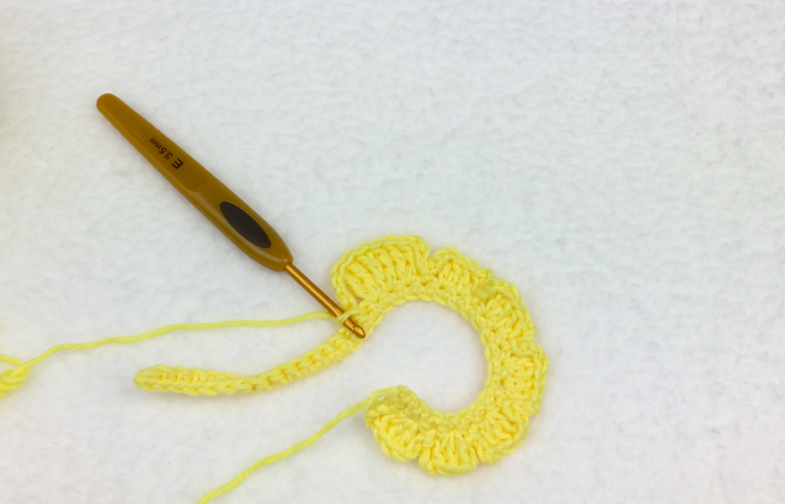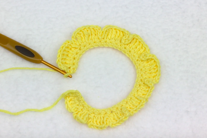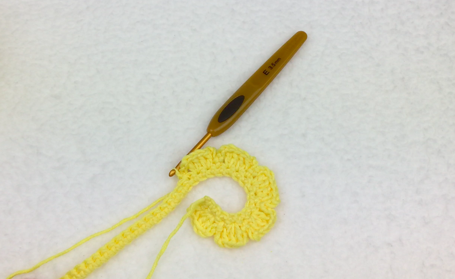 To finish the rose roll it into a rosette shape. Take the end with the smallest petals and begin roll Line up the original chain stitches from your foundation row to create the base of the flower. making sure to keep the base of the flower flat.