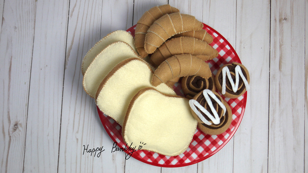 I am so excited to introduce you all to my newest pattern Croissant, cinnamon rolls and sliced bread! These felt food make playing tea party or bakery SO fun! And they are easy to make yourself, without costing too much money. You can make a whole bunch of these, and gift some away for birthday presents or add them to Christmas stockings!